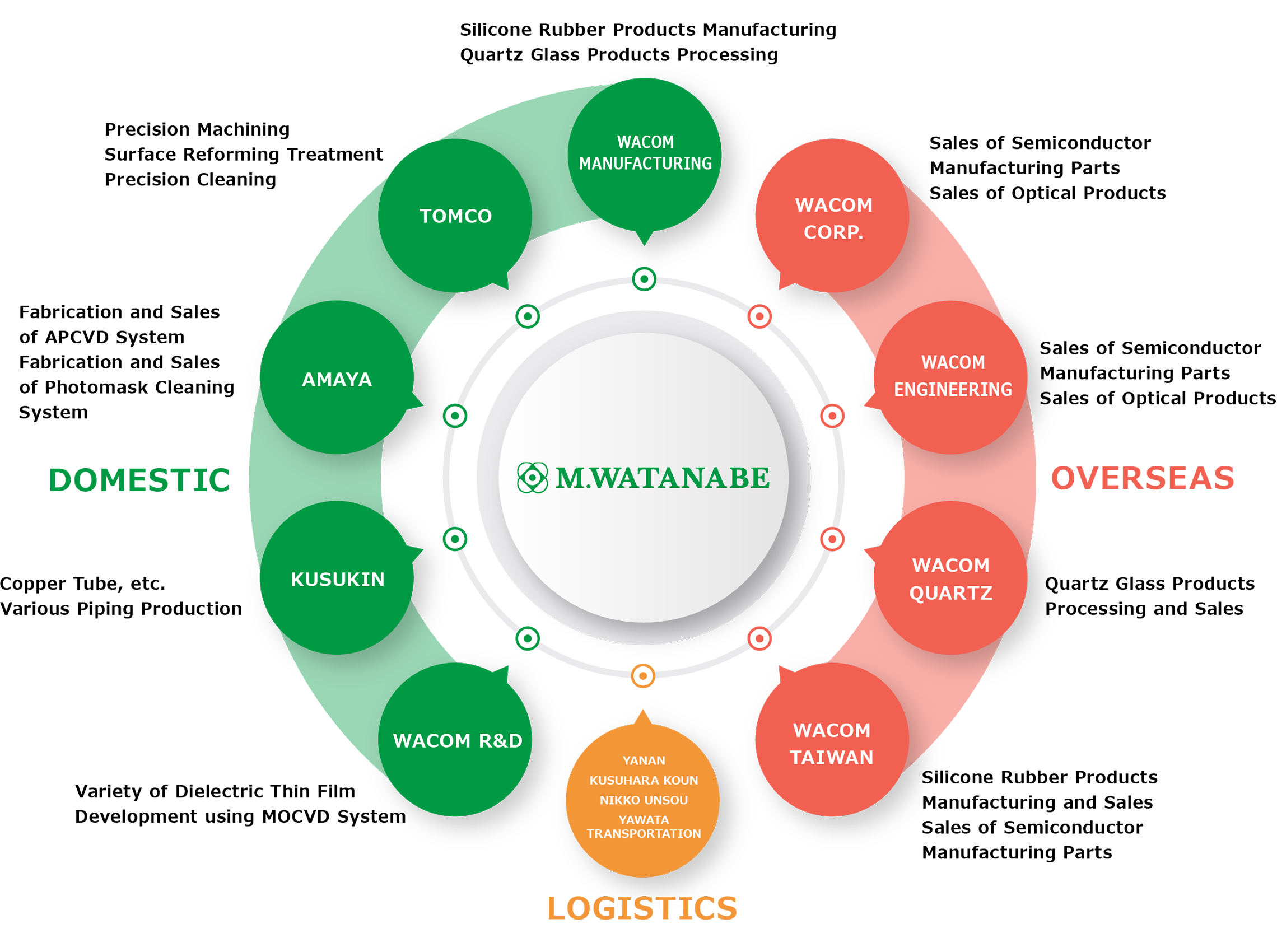 M.WATANABE contributes to the development of semiconductor industry as a manufacturing trading company who can meet various needs as the center of the goup having production bases and sales bases in and outside Japan, and also logistics companies who conduct packing and customs clearance, etc. as group companies.